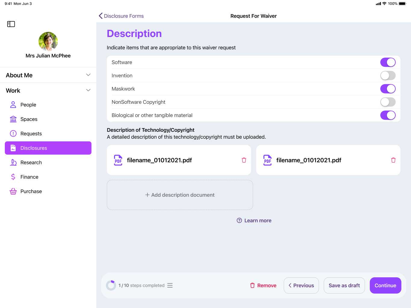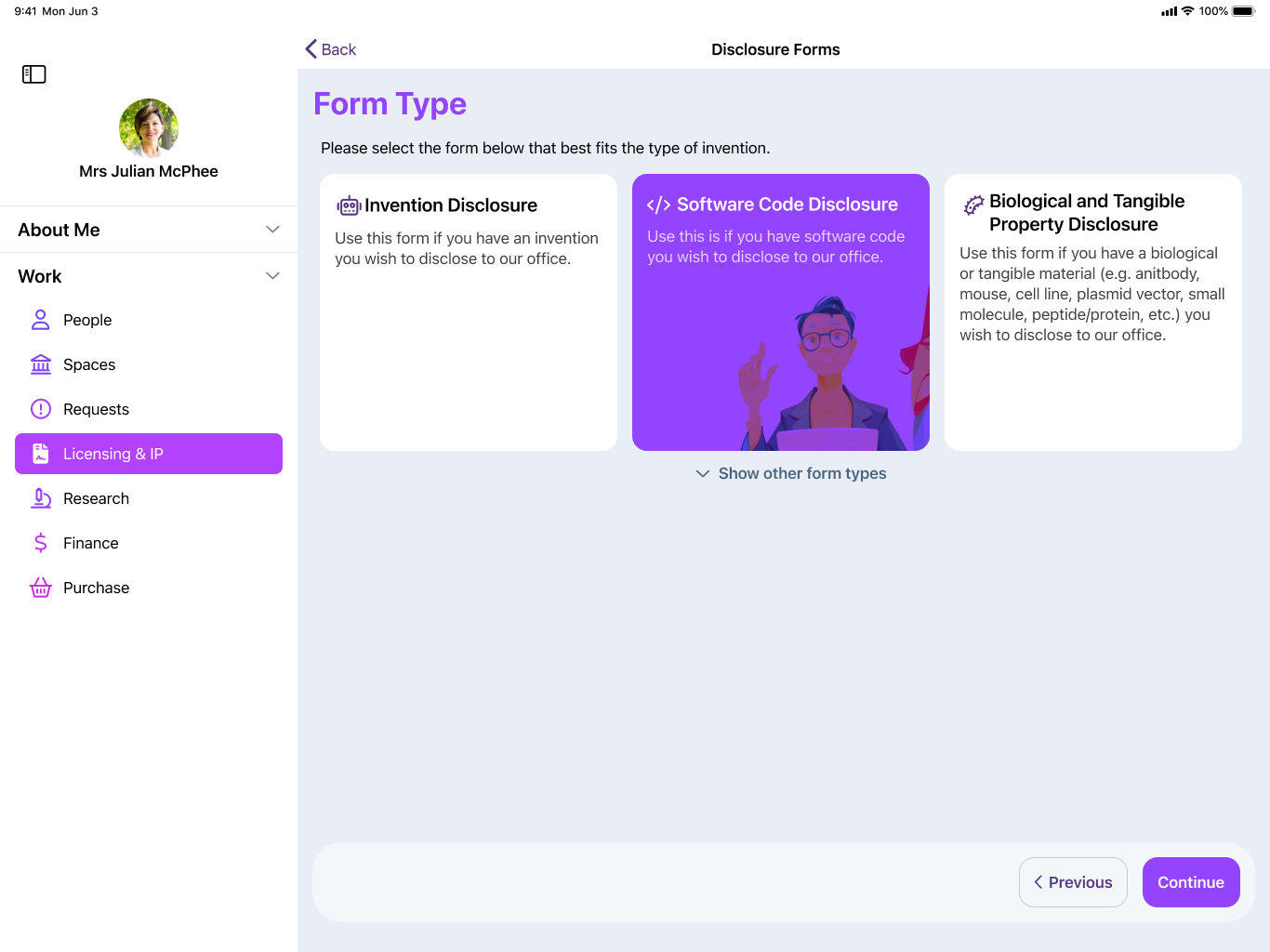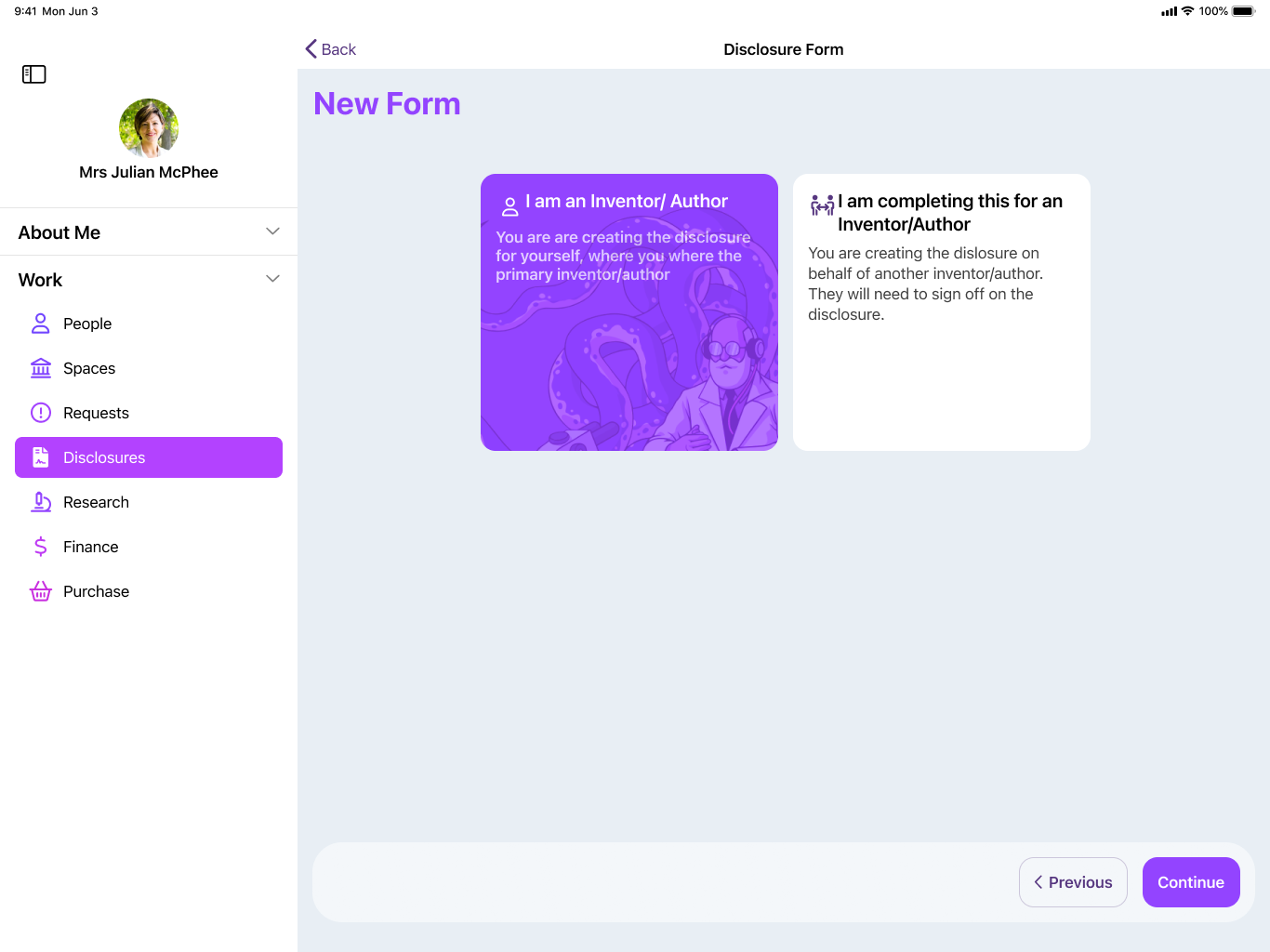 The initial problem was split in two. Firstly, the process that researchers need to follow to disclose their inventions, and secondly